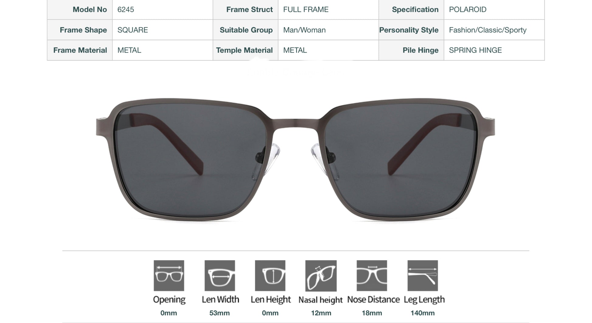 Experience superior eye protection and timeless style with our Model 6245 polaroid sunglasses. Crafted with a full metal frame and spring hinge construction, these unisex square sunglasses deliver exceptional comfort and durability for everyday wear.