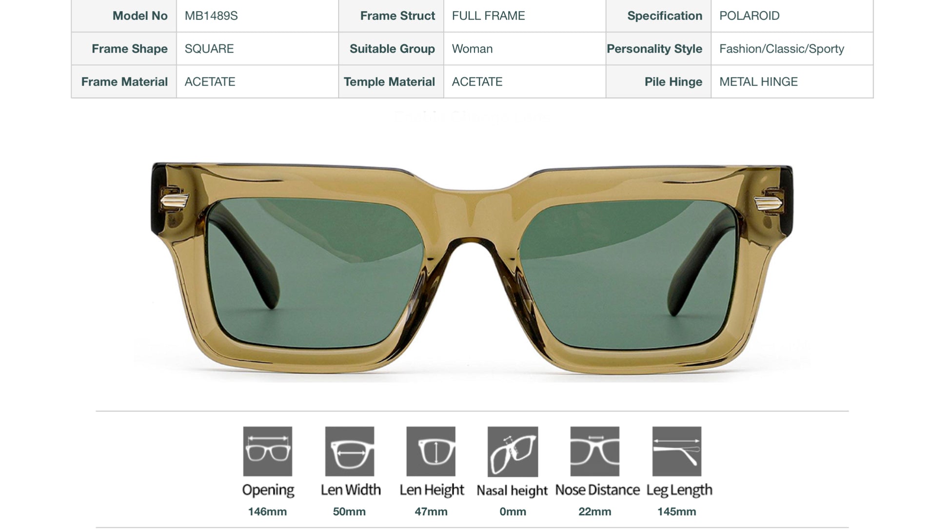 - Precise dimensions: 146mm opening, 50mm lens width, 47mm lens height, 22mm nose distance, 145mm leg length
